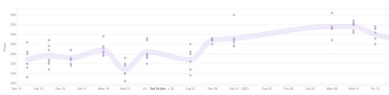 Šel jsem do sebe. Teplota byla kolem nuly a já přesto vypotil všechny intervaly na úrovni 352+W. Jak se zdá, tak tenhle trénink opravdu něco dělá. Navíc jsem získal tento krásný graf, jak mi to letos jde. Navzdory tomu, že se mi délka intervalu zvyšuje, tak roste i výkon.